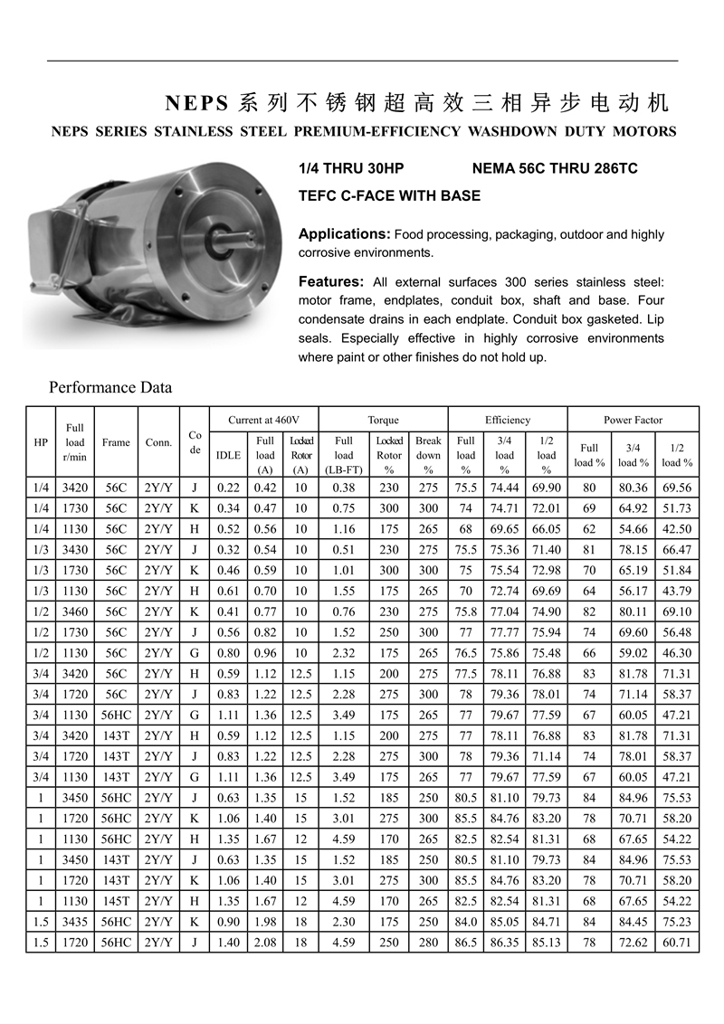 電機具有結構緊湊、體積小、制造周期短、運行可靠、噪聲低、振動小、效率高、耐腐蝕等優點。為特定環境而設計制造的全不銹鋼外殼異步電動機,為NEMA B 設計、高效電機、服務因素為1.15,同時外形美觀。